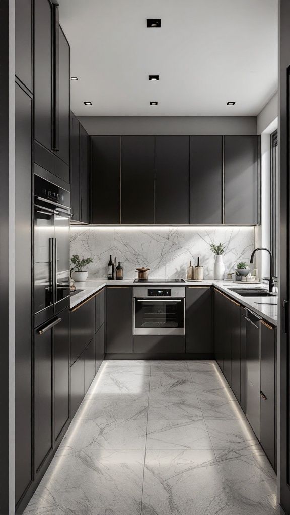 Modern luxury kitchen featuring matte charcoal cabinetry, veined marble backsplash and flooring, under-cabinet lighting, integrated appliances, and sleek minimalist aesthetic.