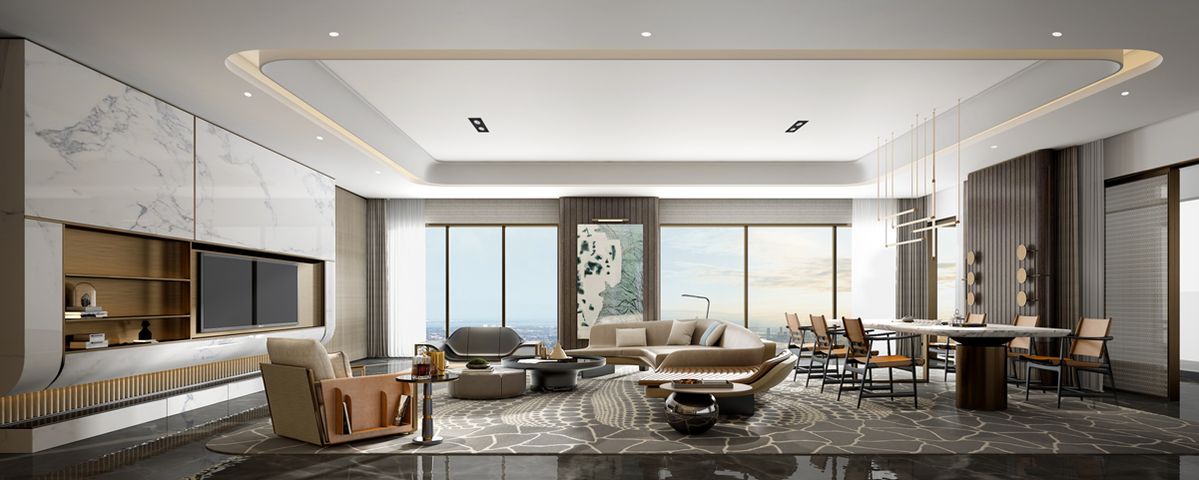 Modern minimalist living room featuring monochromatic beige tones, sleek cove lighting, plush sectional, glossy flooring, and elegant contemporary design elements.